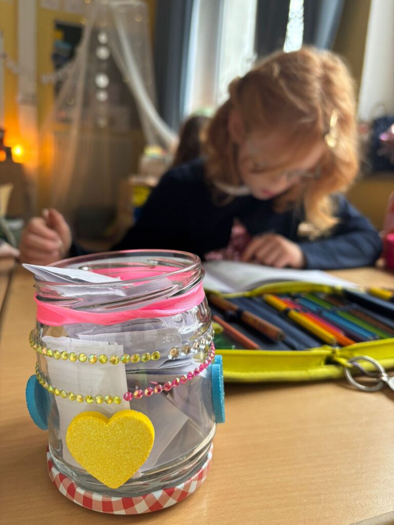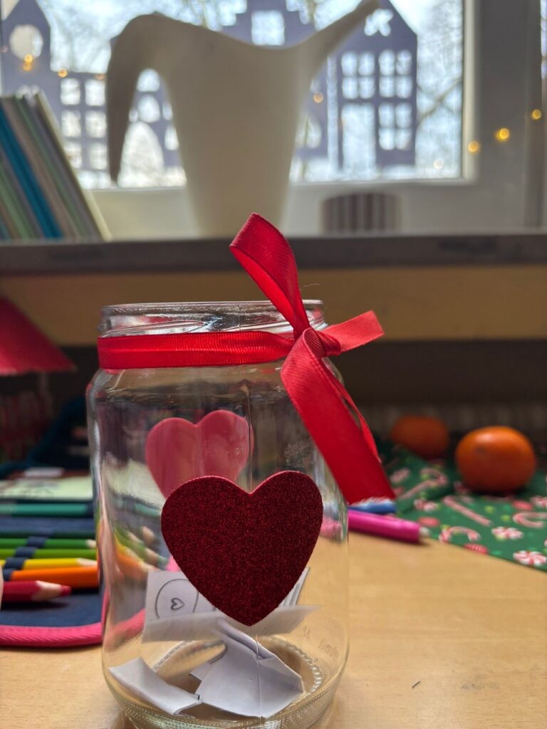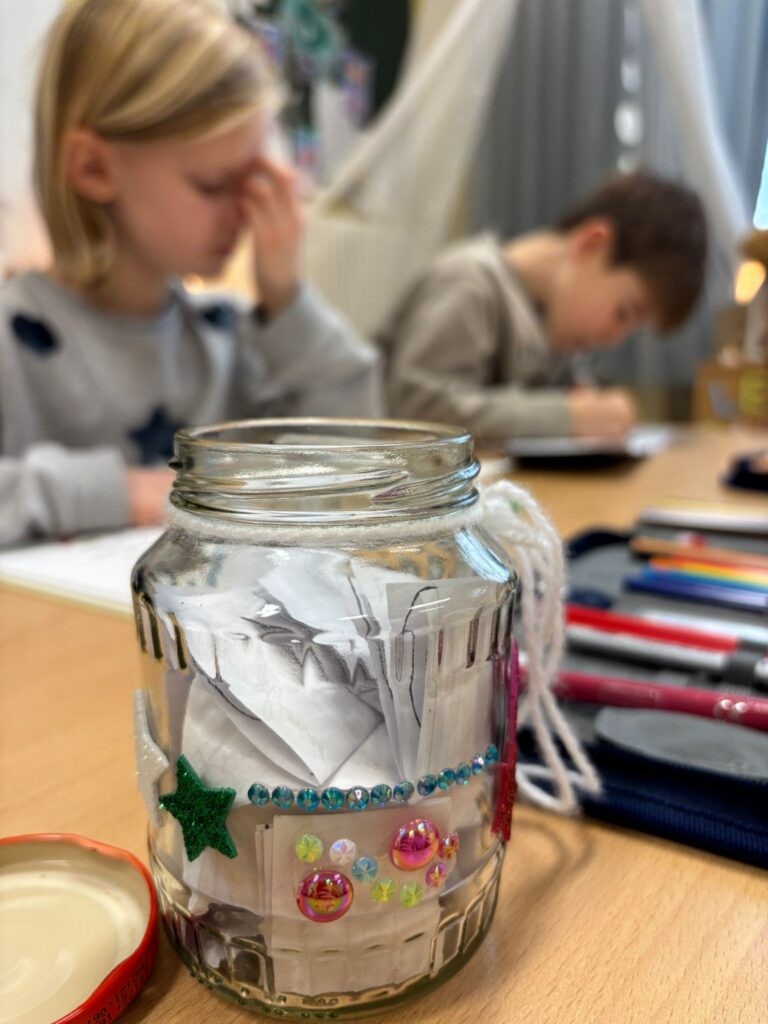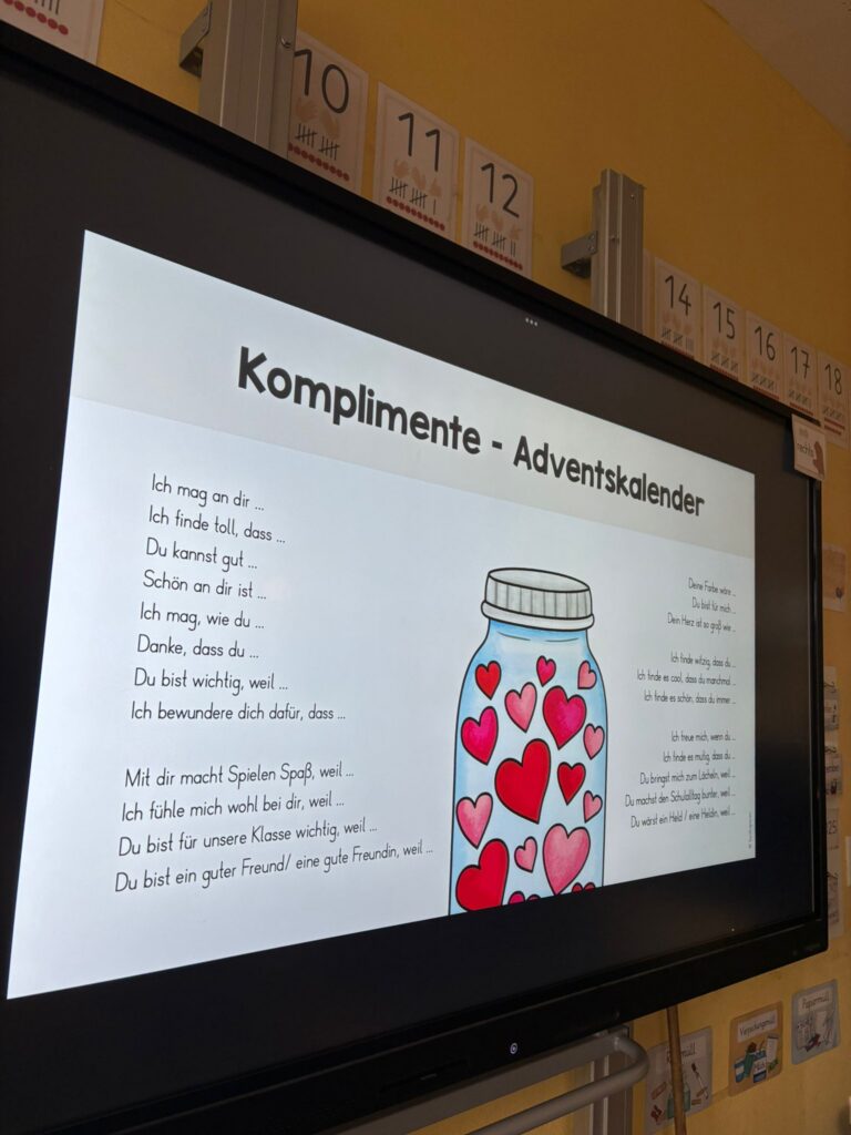 Die Klasse 2a hat dieses Jahr einen ganz besonderen Adventskalender der Komplimente, um die Adventszeit auf eine besondere und wertschätzende Weise zu gestalten. Jeden Tag bekommt ein anderes Kind von allen Kindern der Klasse auf kleinen Zettelchen liebe Worte und positive Rückmeldungen. Diese werden im selbst gestalteten Komplimentglas der Kinder aufbewahrt und dann am letzten Schultag mit nach Hause genommen.